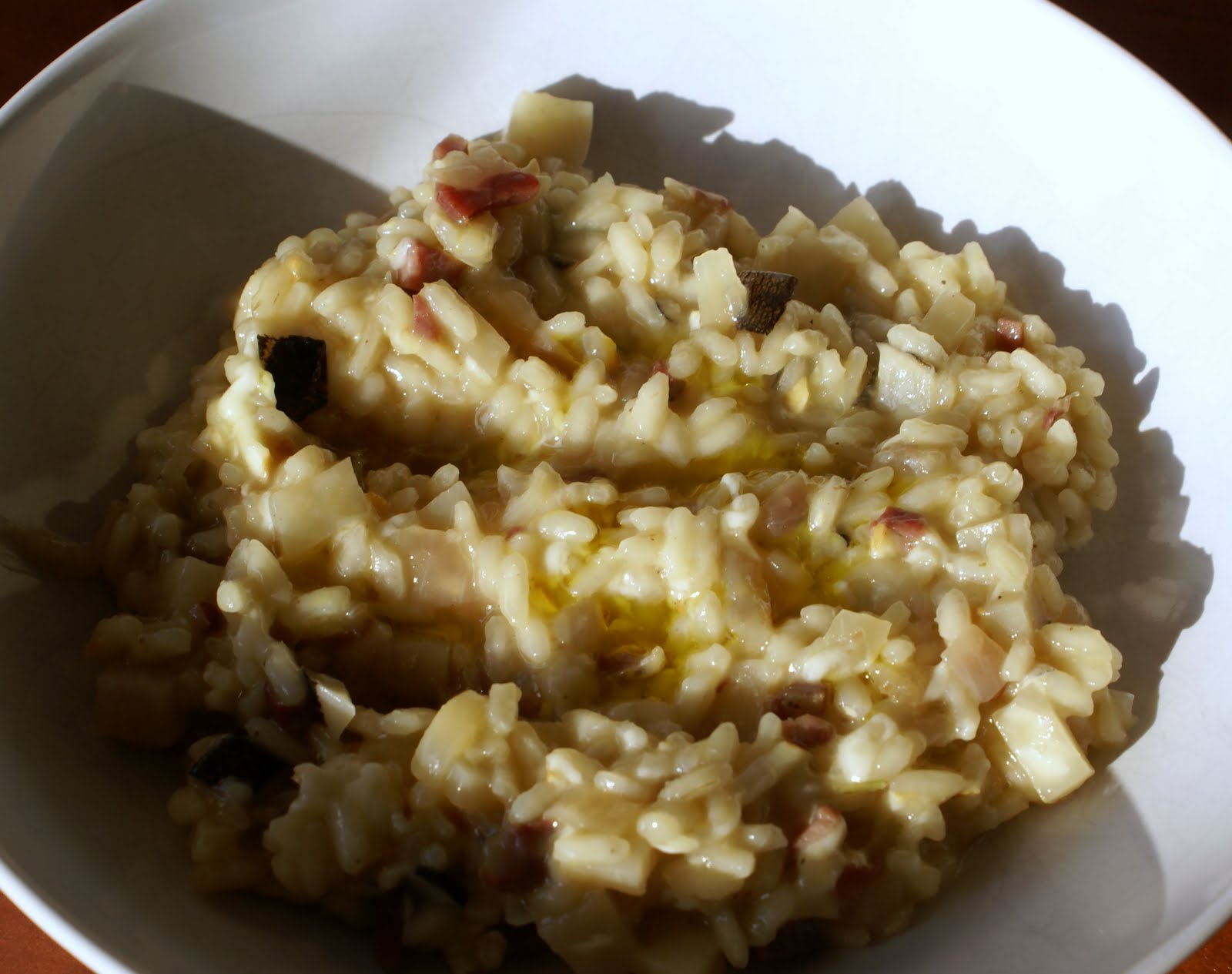 It has a considerably stronger flavour than white turnip: earthy, spicy and peppery. (It also gives off a rather unpleasant smell when boiled, like boiled cauliflower but worse, so it’s best cooked in butter or oil). When really fresh it can be grated into a salad, and is an excellent raw material for deep-fried crisps.The range of culinary preparations, in fact, is wide – I recall a friend reducing black turnip wedges in a bottle of Tokaji eszencia: a really expensive dish but a fabulous explosion of sweet & savoury flavours! One of standard preparations is black turnip risotto. I use light vegetable stock for this recipe, to let the turnip flavours dominate the whole. In this season, the addition of toasted, roughly chopped fresh hazelnuts at the end of cooking adds a luxurious twist, as does a generous helping of a tangy grated pecorino.
