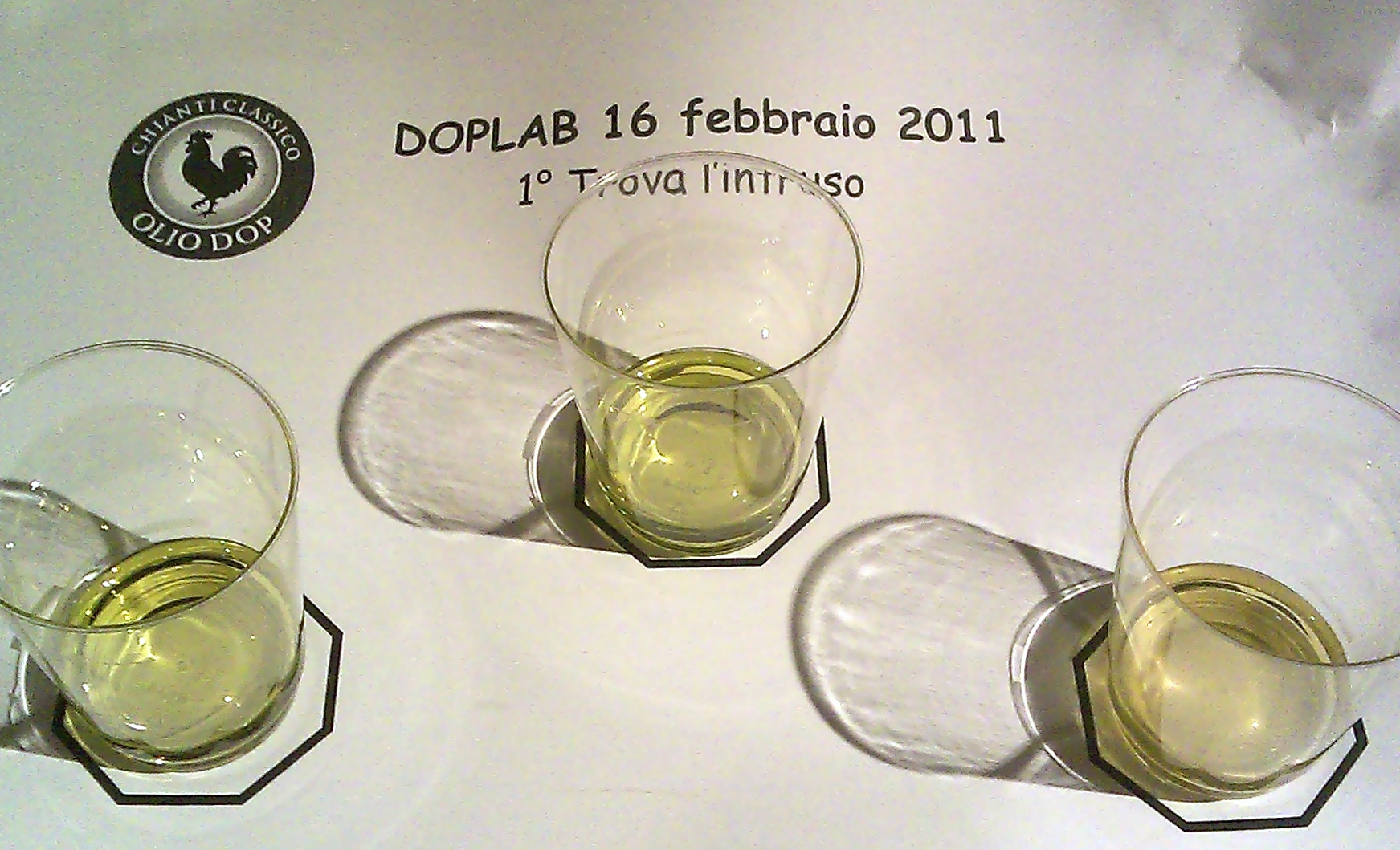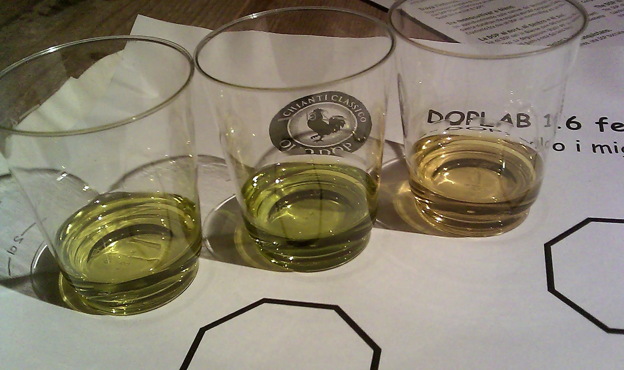 Based on this tasting and my former experience, I can say that the DOP classification for an Italian olive oil is a serious qualitative recognition. Unlike for wine – where nearly every sample submitted will get the DOC seal – the tastings for oil appear to be pretty stringent. I’ve never had a DOP oil that was mediocre. And one of the flights on this blind tasting featured an oil that passed the DOP exam, one that was deemed faulty, and another that was denied the DOP: although technically correct, it lacked the characteristics of freshness and vibrancy requested from an DOP Chianti oil. Here’s a photo of those oils: