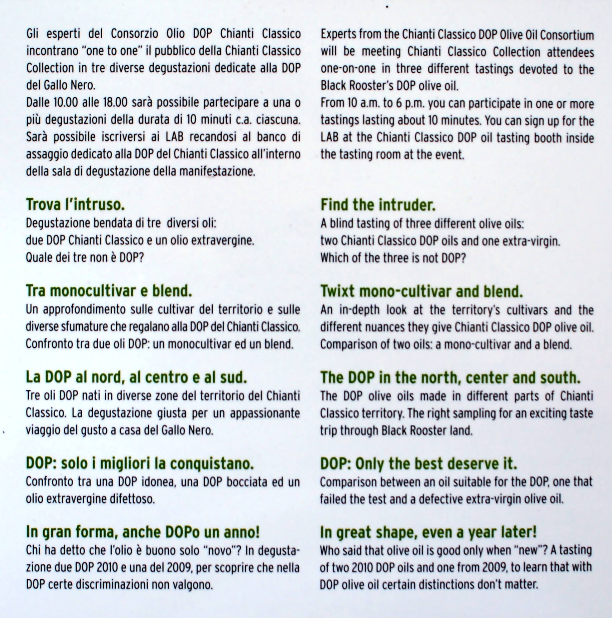 I took the complete tour: five themed blind tastings according to the programme you can see on the photo above. It was really interesting. The flights were well-planned too; even a relative novice such as yours truly could easily solve the various riddles. For example, sorting out a (high-priced) supermarket extra virgin oil from two certified DOP Chianti Classico appellation oils was fairly obvious: it was quite OK but had a tiny bit of oxidation and a chemical aroma. In contrast, the two DOPs were bursting with clean vegetal freshness and had a much longer aftertaste. The side-by-side comparison of 2010 and 2009 oils was also eye-opening: the latter had lost a bit of aromatic vibrancy but was not at all declining, with good depth of taste and attractive sweetness. That flight surely made a statement about DOP oils being able to age in bottle for a year, something I didn’t take for granted formerly.