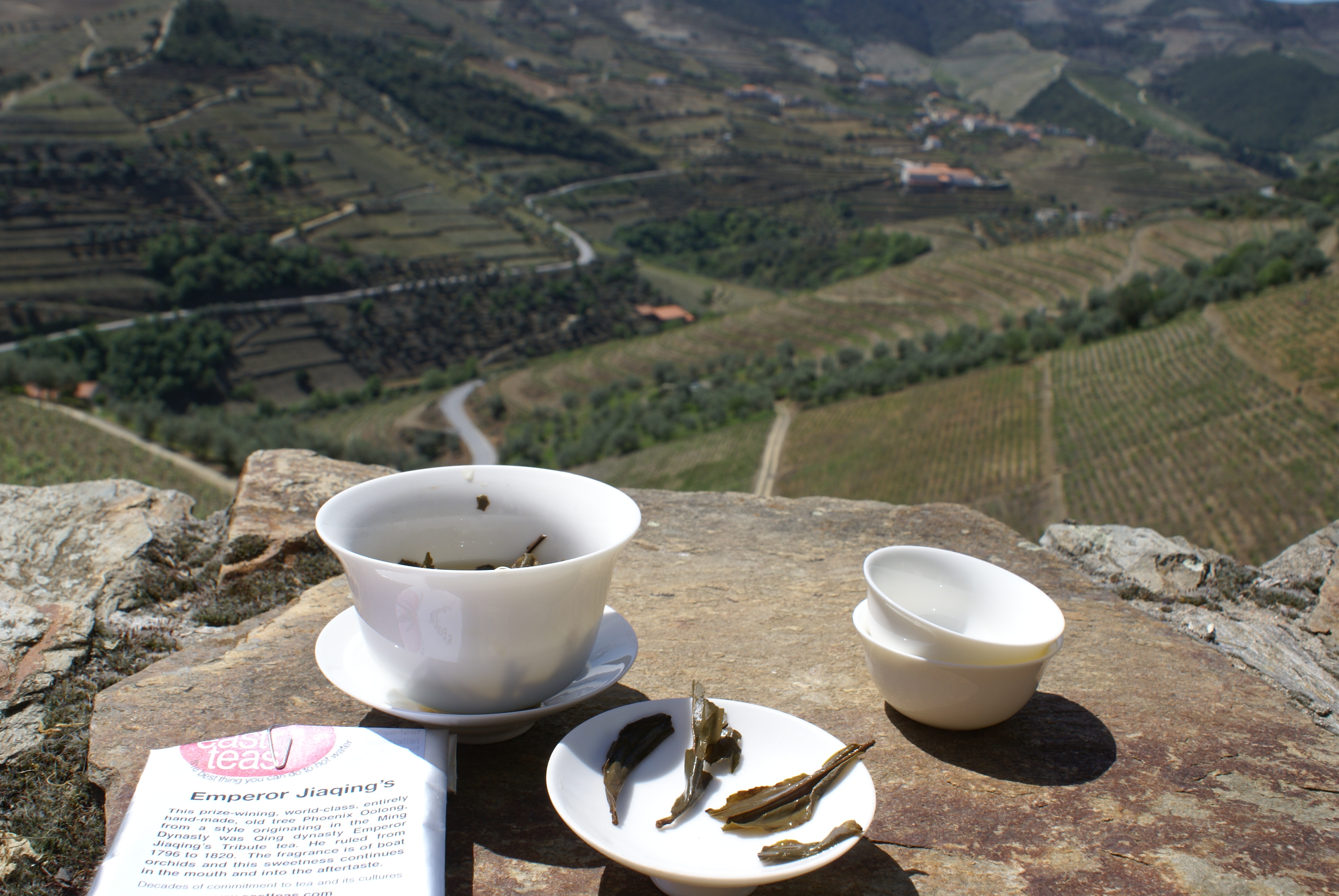 I’m in Portugal for two weeks. That’s a long time away from my tea shelf. I recently blogged on drinking tea while travelling. This time, I took four different teas to enjoy in alternation and avoid the boredom. Staying at wine quintas in the Douro region of Portugal (essentially the private houses of wine producers), I’ve also enjoyed better access to hot water and more comfortable brewing conditions that I normally have in hotels. I also followed the advice of one of my readers and took a gaiwan.