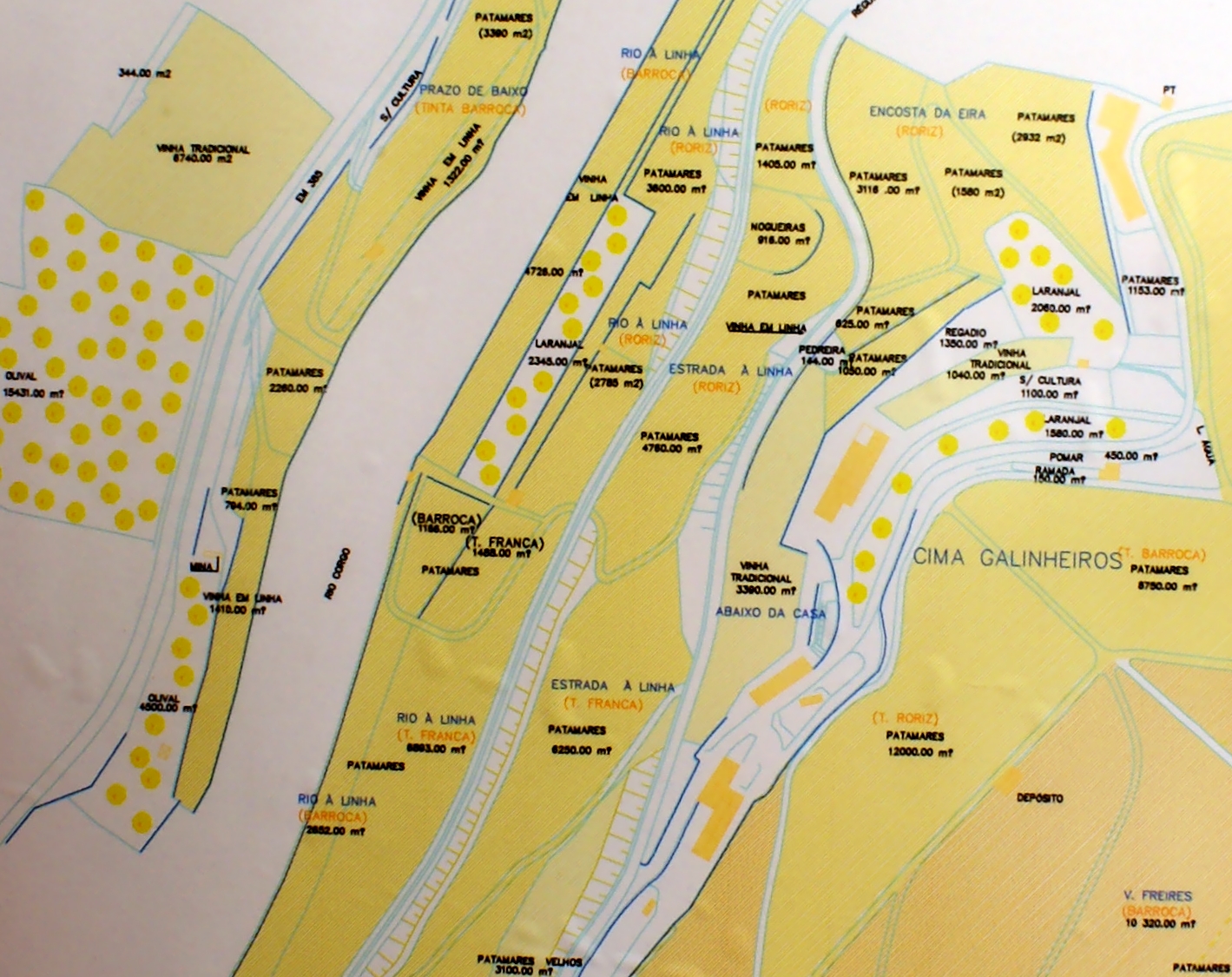 This map (about 10% of Vallado vineyards) shows the complexity of the Douro: parcels have different exposures, inclinations, grape varieties and vine age.